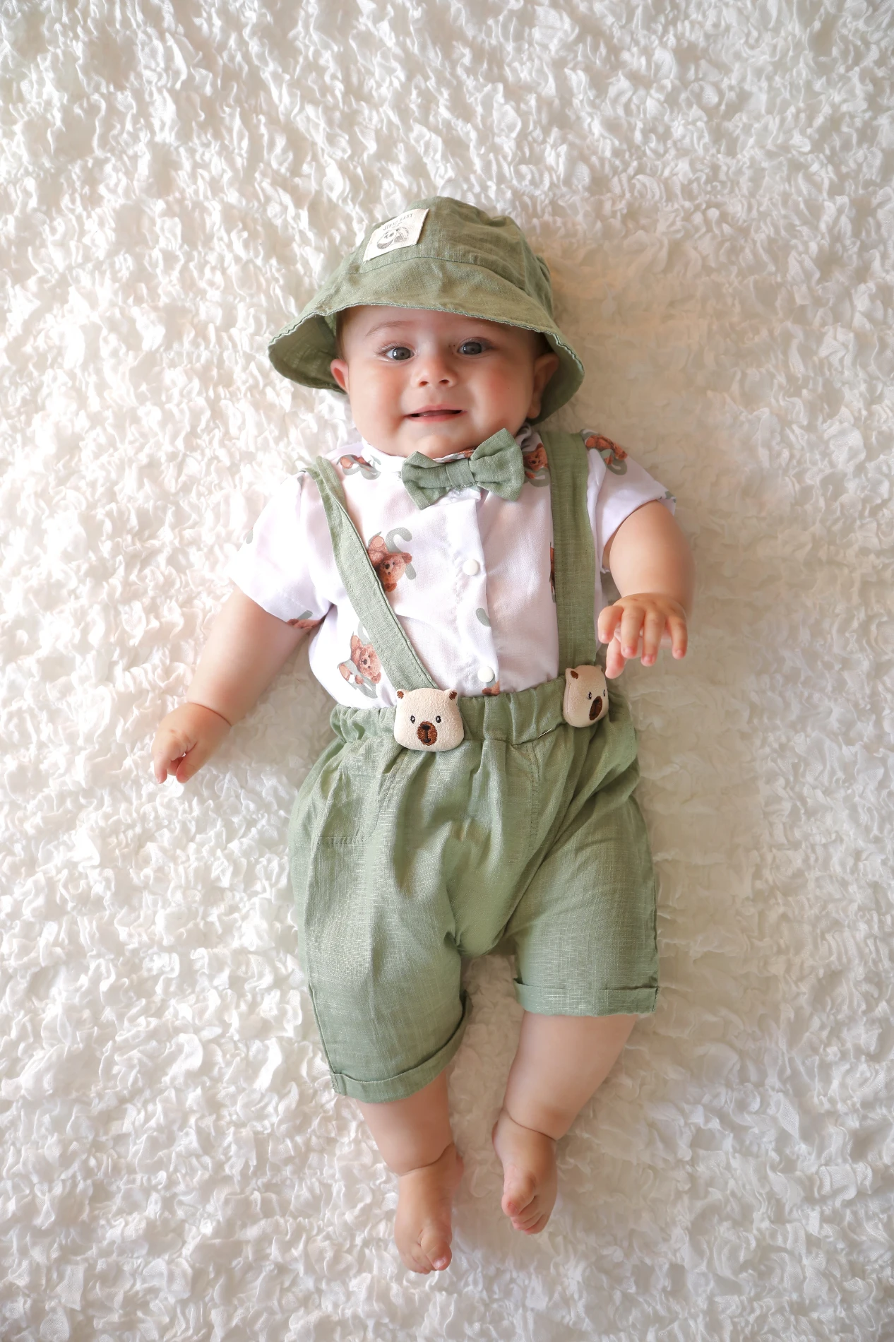Ayıcık Desenli Papyonlu Gömlekli Bucket Şapkalı Müslin Salopetli Tarz 3’lü Takım