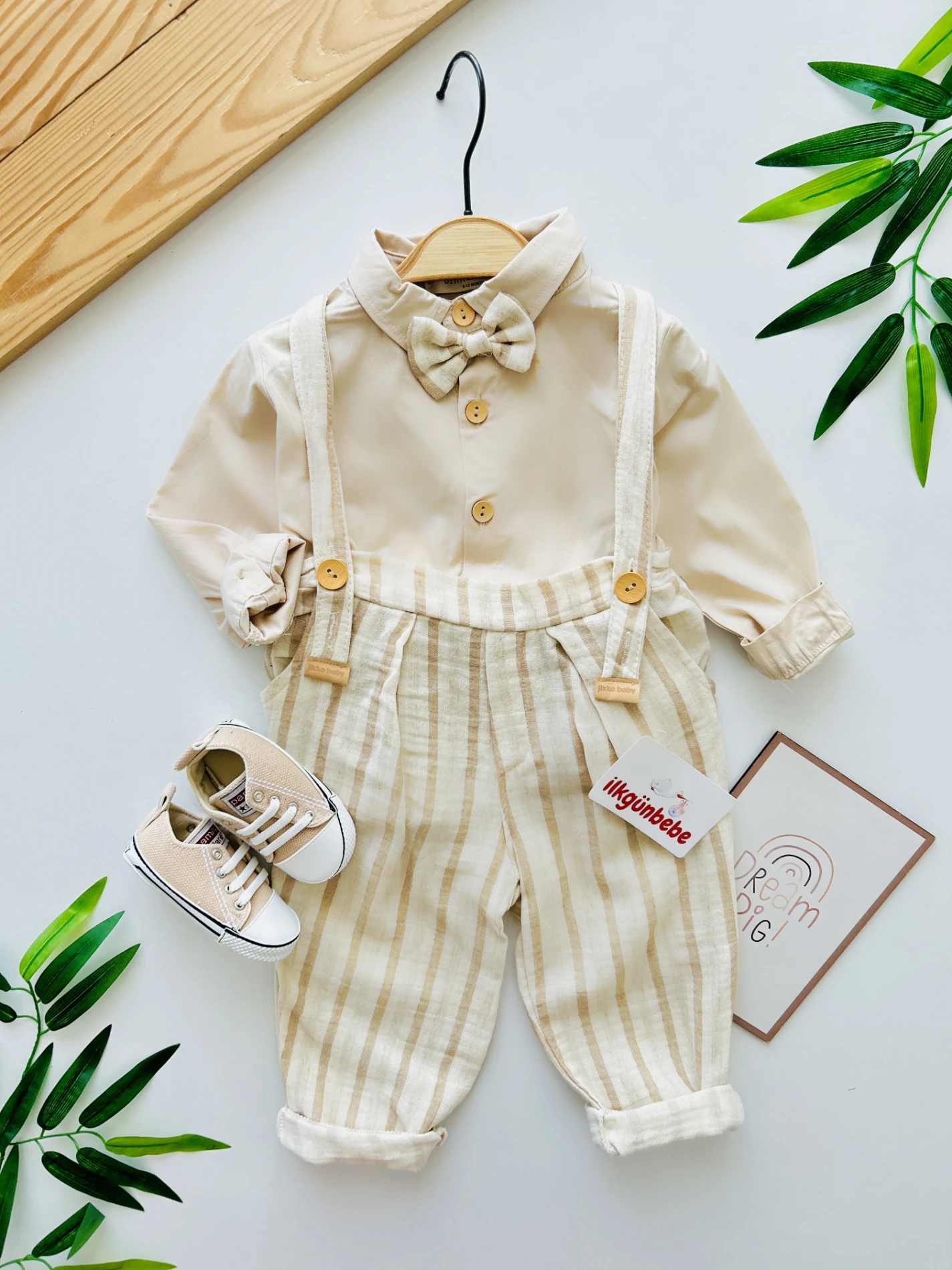 Çarpraz Askılı Müslin Kumaş Salopetli Papyonlu Gömlekli Şık Takım