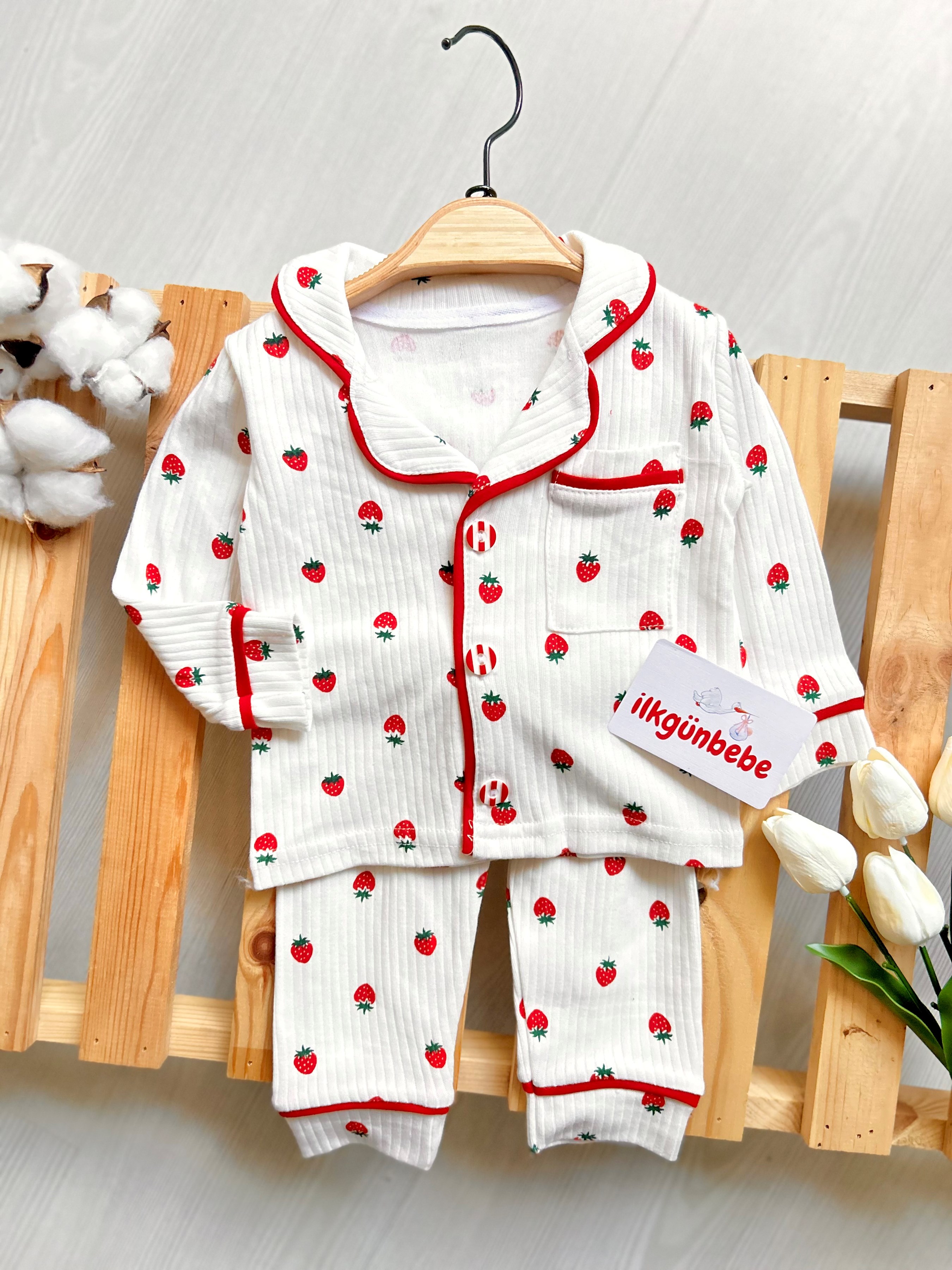 Çilek Desenli Bebe Yakalı %100 Pamuk Pijama Takımı