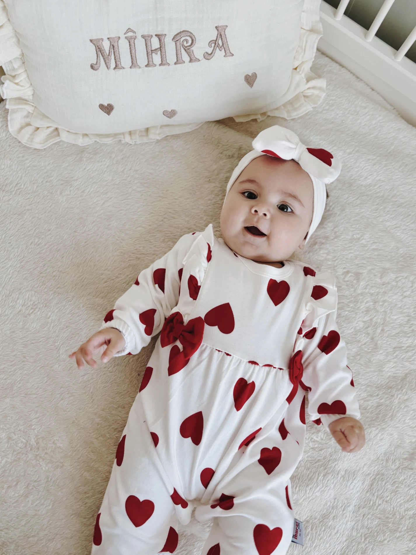 Kalp Desenli %100 Pamuk Fiyonk Detaylı Bandanalı & Tulum Set