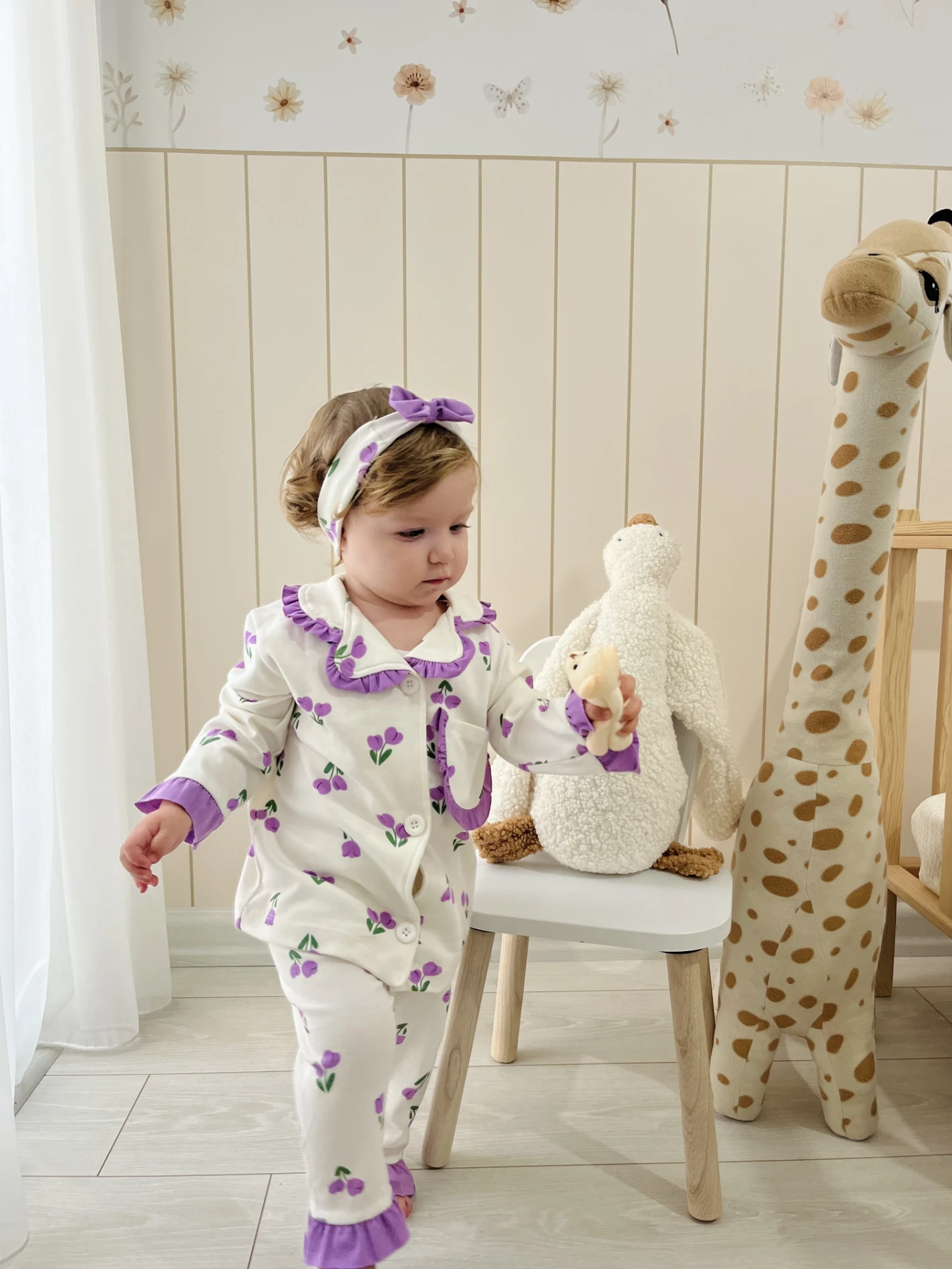 Lale Temalı Bebe Yakalı %100 Pamuk Fırfır Detaylı Bandanalı 3’lü Pijama Takımı