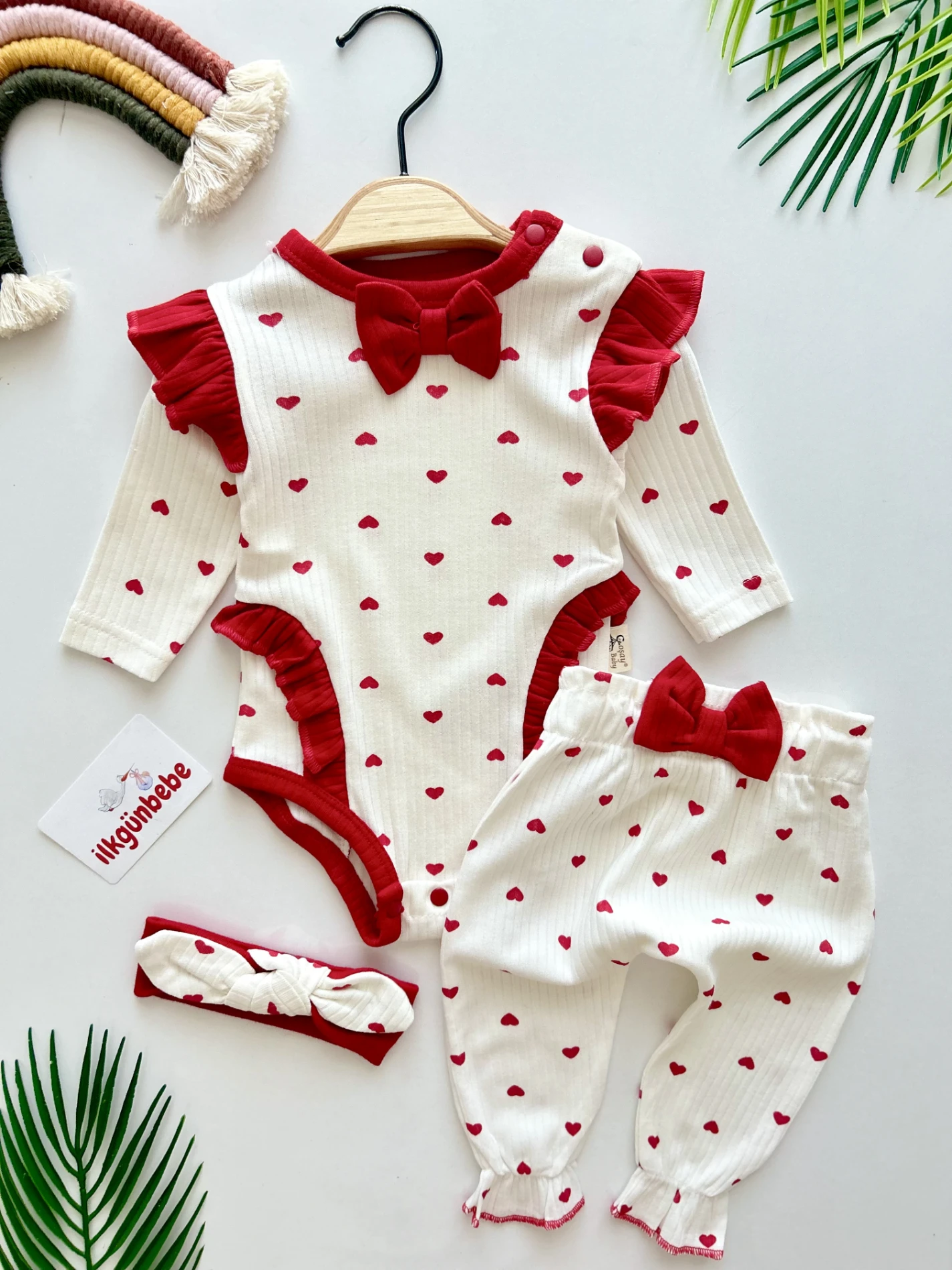 Minik Kalp Desenli Fiyonk Detaylı Bandanalı 3’lü %100 Pamuk Mevsimlik Kız Takım